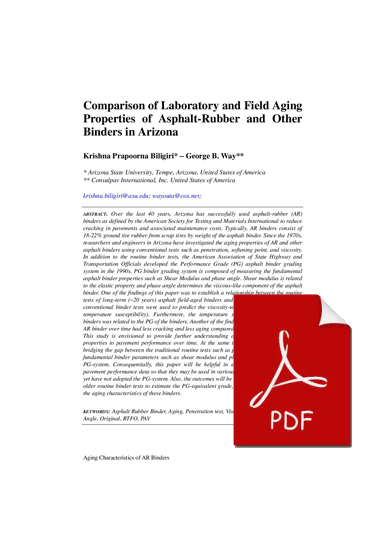 Over the last 40 years, Arizona has successfully used asphalt-rubber (AR) binders as defined by the American Society for Testing and Materials International to reduce cracking in pavements and associated maintenance costs. Typically, AR binders consist of 18-22% ground tire rubber from scrap tires by weight of the asphalt binder. Since the 1970s, researchers and engineers in Arizona have investigated the aging properties of AR and other asphalt binders using conventional tests such as penetration, softening point, and viscosity. In addition to the routine binder tests, the American Association of State Highway and Transportation Officials developed the Performance Grade (PG) asphalt binder grading system in the 1990s. PG binder grading system is composed of measuring the fundamental asphalt binder properties such as Shear Modulus and phase angle. Shear modulus is related to the elastic property and phase angle determines the viscous-like component of the asphalt binder. One of the findings of this paper was to establish a relationship between the routine tests of long-term (~20 years) asphalt field-aged binders and the PG system. In addition, conventional binder tests were used to predict the viscosity-temperature relationships (i.e. temperature susceptibility). Furthermore, the temperature susceptibility of the asphalt binders was related to the PG of the binders. Another of the findings of the study was that the AR binder over time had less cracking and less aging compared to the other asphalt binders. This study is envisioned to provide further understanding of the degree of field aging properties to pavement performance over time. At the same time, this work will assist in bridging the gap between the traditional routine tests such as penetration and viscosity and fundamental binder parameters such as shear modulus and phase angle in addition to the G-system. Consequentially, this paper will be helpful in examining binder aging and pavement performance data so that they may be used in various parts of the world that as of yet have not adopted the PG-system. Also, the outcomes will be valuable to be able to use the older routine binder tests to estimate the PG-equivalent grade, and draw conclusions about the aging characteristics of these binders.