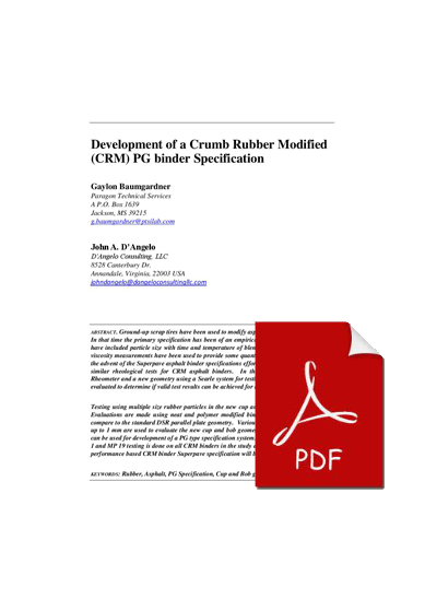 Testing using multiple size rubber particles in the new cup and bob geometry is evaluated. Evaluations are made using neat and polymer modified binders in the new geometry to compare to the standard DSR parallel plate geometry. Various sizes of CRM from 0.25 μm up to 1 mm are used to evaluate the new cup and bob geometry to determine if the results can be used for development of a PG type specification system. Full AASHTO M 320 Table 1 and MP 19 testing is done on all CRM binders in the study and from this data a proposed performance based CRM binder Superpave specification will be developed.