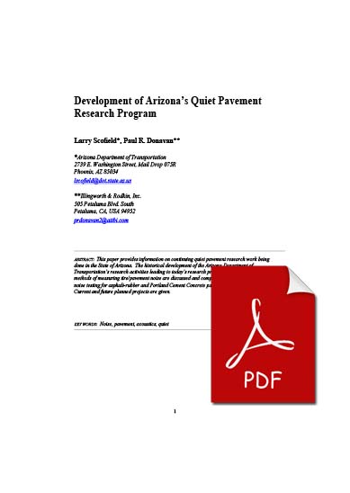 This paper provides information on continuing quiet pavement research work being done in the State of Arizona. The historical development of the Arizona Department of Transportation’s research activities leading to today’s research program is outlined. Different methods of measuring tire/pavement noise are discussed and compared. Results of pavement noise testing for asphalt-rubber and Portland Cement Concrete pavements are presented. Current and future planned projects are given.