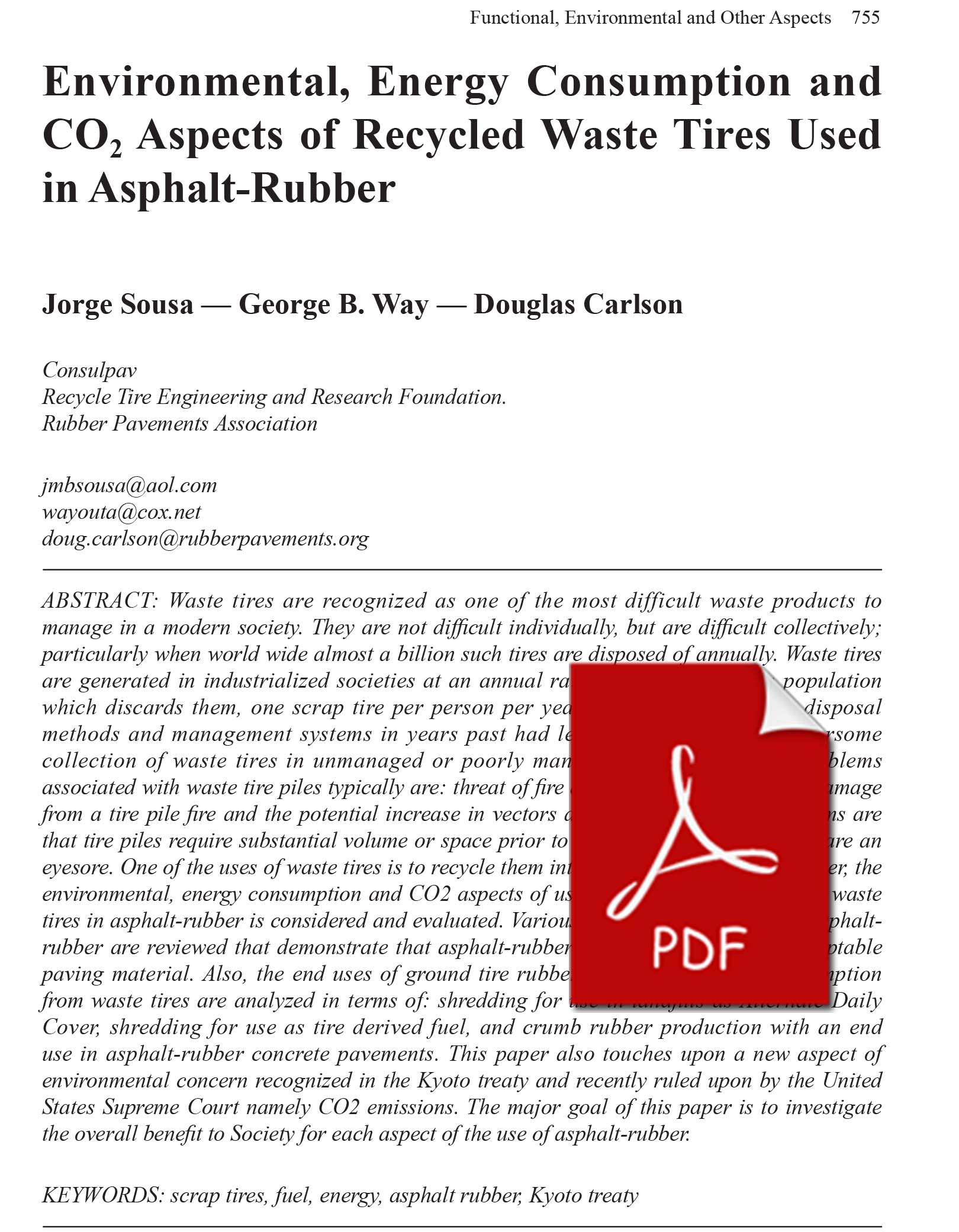 that tire piles require substantial volume or space prior to any type of processing and are an eyesore. One of the uses of waste tires is to recycle them into asphalt-rubber. In this paper, the environmental, energy consumption and CO2 aspects of using ground tire rubber from waste tires in asphalt-rubber is considered and evaluated. Various environmental studies of asphaltrubber are reviewed that demonstrate that asphalt-rubber is an environmentally acceptable paving material. Also, the end uses of ground tire rubber in terms of energy consumption from waste tires are analyzed in terms of: shredding for use in landfills as Alternate Daily Cover, shredding for use as tire derived fuel, and crumb rubber production with an end use in asphalt-rubber concrete pavements. This paper also touches upon a new aspect of environmental concern recognized in the Kyoto treaty and recently ruled upon by the United