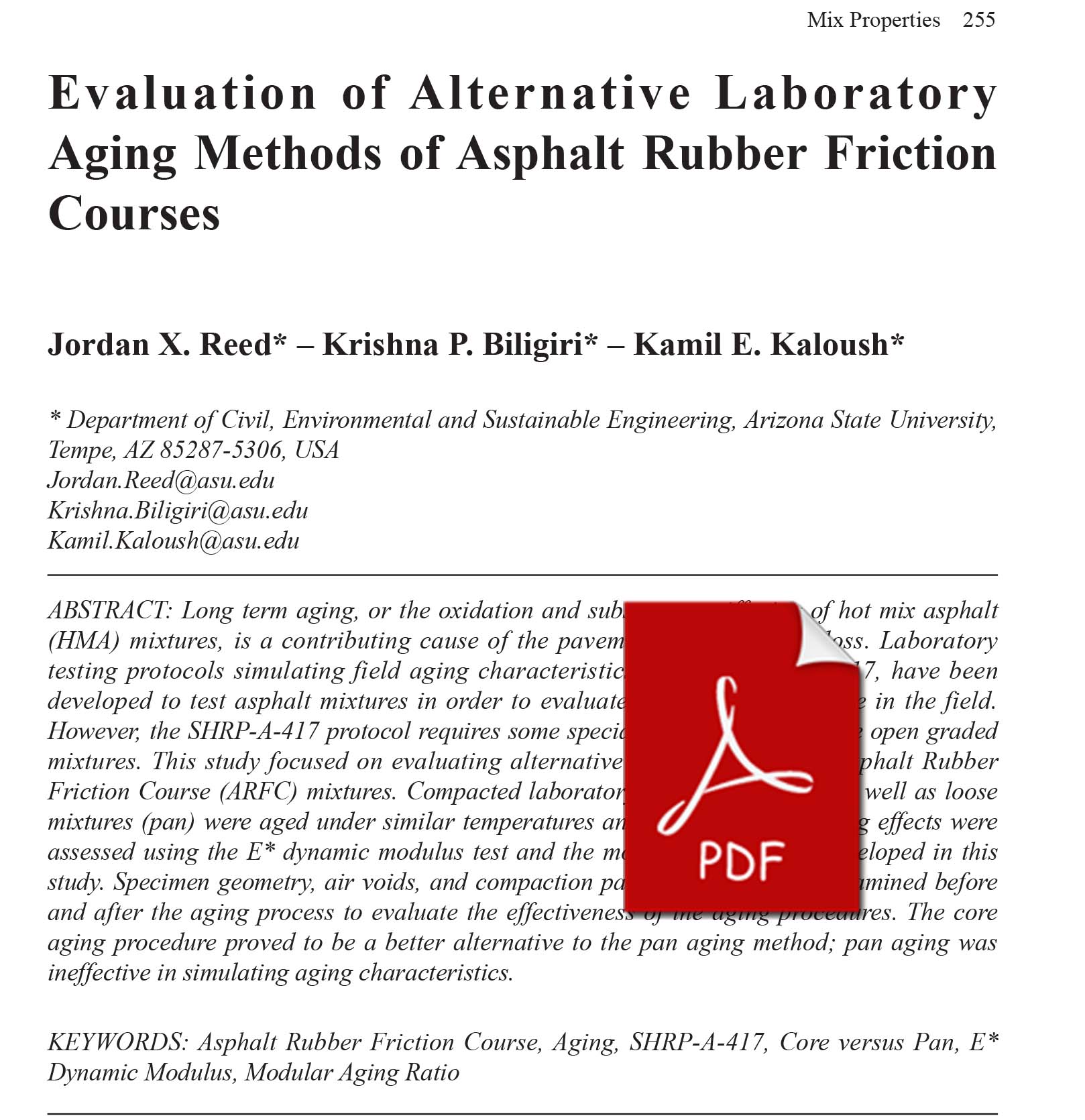 However, the SHRP-A-417 protocol requires some specialized equipment to age open graded mixtures. This study focused on evaluating alternative aging methods for Asphalt Rubber Friction Course (ARFC) mixtures. Compacted laboratory specimens (cores) as well as loose mixtures (pan) were aged under similar temperatures and time durations. Aging effects were assessed using the E* dynamic modulus test and the modular aging ratio developed in this study. Specimen geometry, air voids, and compaction parameters were also examined before and after the aging process to evaluate the effectiveness of the aging procedures. The core aging procedure proved to be a better alternative to the pan aging method; pan aging was ineffective in simulating aging characteristics.