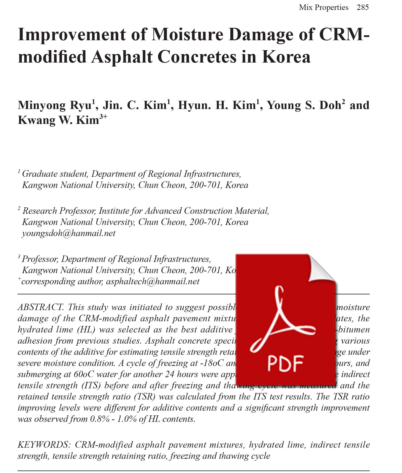 This study was initiated to suggest possible solution for preventing moisture damage of the CRM-modified asphalt pavement mixtures. Among many candidates, the hydrated lime (HL) was selected as the best additive for improving aggregate-bitumen adhesion from previous studies. Asphalt concrete specimens were prepared using various