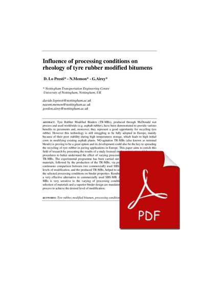 Tyre Rubber Modified Binders (TR-MBs), produced through McDonald wet process and used worldwide (e.g. asphalt rubber), have been demonstrated to provide various benefits to pavements and, moreover, they represent a good opportunity for recycling tyre rubber. However this technology is still struggling to be fully adopted in Europe, mainly because of their poor stability during high temperatures storage, which leads to high initial costs in modifying existing asphalt plants. NO-agitation TR-MBs (also known as terminal blends) is proving to be a great option and its development could also be the key to spreading the recycling of tyre rubber in paving applications in Europe. This paper aims to enrich this field of research by presenting the results of a study focused on the optimisation of laboratory procedures to better understand the effect of varying processing conditions on the rheology TR-MBs. The experimental programme has been carried out by a preliminary selection of materials, followed by the production of the TR-MBs, via practical laboratory protocols. A continuous comparison between two commercially used SBS-MBs, with high and medium levels of modification, and the produced TR-MBs, helped to understand the effect of varying the selected processing conditions on binder properties. Results have shown that TR-MBs are a very effective alternative to commercially used SBS-MB. Although the rheology of TRMBs is very sensitive to the varying of processing conditions, therefore an appropriate selection of materials and a superior binder design are mandatory to optimise the modification process to achieve the desired level of modification.