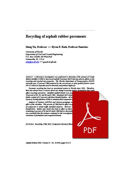 Pavement recycling has been an operational system in Florida since 1983. Therefore, there has always been a concern about any change in paving mixture formulation that could affect recycling operations. Modified asphalt blends were prepared with an AC-30, 12 and 18 percent of 20, 40, and 80 mesh CRM. Simulated RAP mixtures were prepared at a design binder content of 6.5 percent with these blended binders. All mixtures were compacted in the Gyratory Testing Machine (GTM) to simulate field compacted and traffic densities.