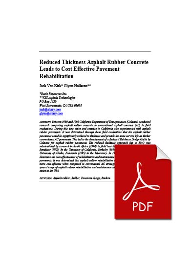 Between 1980 and 1992 California Department of Transportation (Caltrans) conducted research comparing asphalt rubber concrete to conventional asphalt concrete (AC) in field evaluations. During this time cities and counties in California also experimented with asphalt rubber pavements. It was determined through these field evaluations that the asphalt rubber pavements could be significantly reduced in thickness and provide the same service life as thicker conventional AC pavements. This led to the development of a Reduced Thickness Design Guide by Caltrans for asphalt rubber pavements. The reduced thickness approach (up to 50%) was substantiated by research in South Africa (1994) in field installations using the Heavy Vehicle Simulator (HVS), by the University of California, Berkeley (1994) in the laboratory and by the University of Alaska, Fairbanks (1995) in the laboratory. In 1999 research was conducted to determine the cost-effectiveness of rehabilitation and maintenance strategies using asphalt rubber pavements. It was determined that asphalt rubber rehabilitation and maintenance strategies are more cost-effective when compared to conventional AC strategies. This has led to more wide spread usage of asphalt rubber rehabilitation and maintenance strategies in California and other states in the USA.