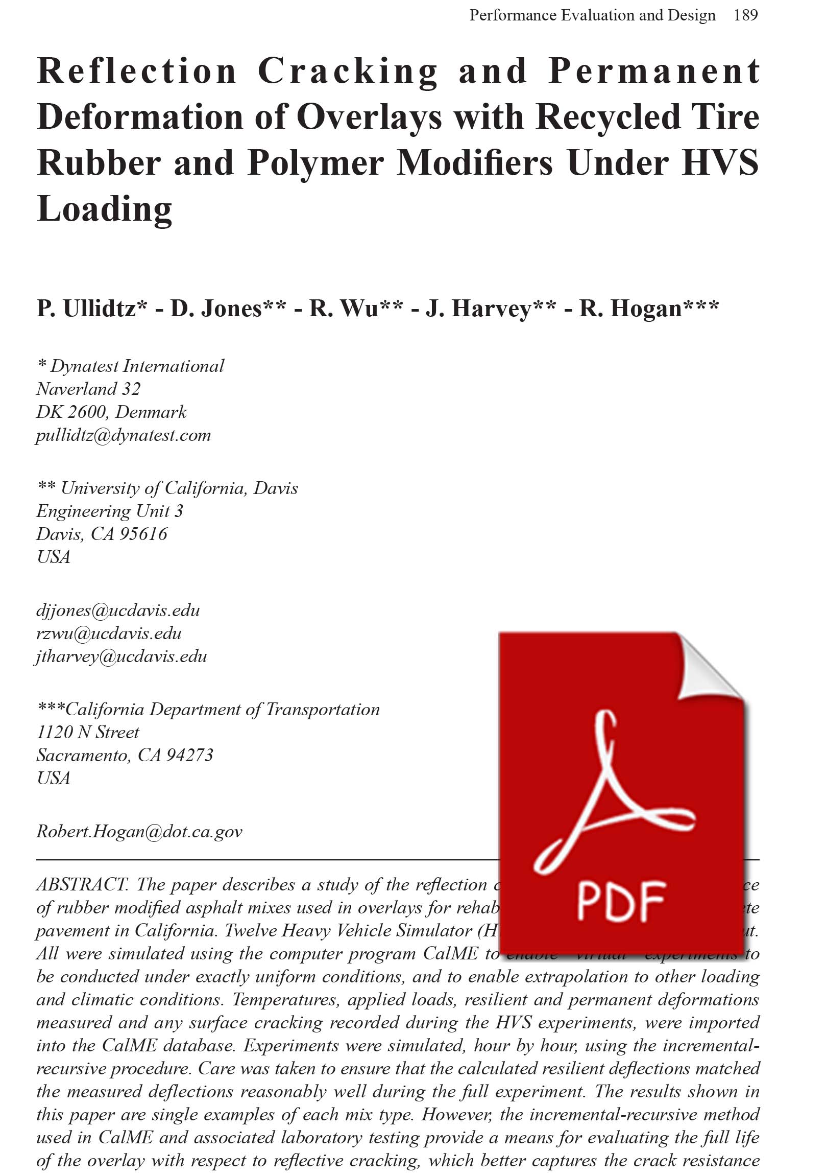 The paper describes a study of the reflection cracking and rutting performance of rubber modified asphalt mixes used in overlays for rehabilitating cracked asphalt concrete pavement in California. Twelve Heavy Vehicle Simulator (HVS) experiments were carried out. All were simulated using the computer program CalME to enable “virtual” experiments to be conducted under exactly uniform conditions, and to enable extrapolation to other loading
