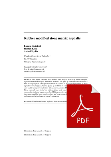 This paper contains tests methods and analysis results of rubber modified asphalts and rubber modified bituminous mixtures. Two types of road asphalts were tested – hard and soft asphalt. The influence of rubber additive on rheological properties of these asphalts were analyzed. Positive effects of modification were recorded. Modified asphalts were used to design new materials – Stone matrix asphalts (SMA), with rubber modification. These materials were tested on rutting, fatigue and water resistant. Tests results were compared to technical requirements for SMA layers, which are used in Poland. It was found that rubber modified stone matrix asphalts had better properties that conventional materials and they could be implemented to road engineering.