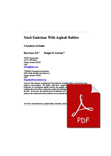 The emissions resulting from the production of asphalt rubber concrete have been subject to much analysis. The studies often have compared the stack emissions from the production of conventional asphalt concrete and asphalt rubber concrete. This document combines the work of three comparative studies from Michigan, Texas and California within the USA. In all cases, the emissions from AR materials were within the allowable limits and similar to the emissions from the production of conventional asphalt concrete.