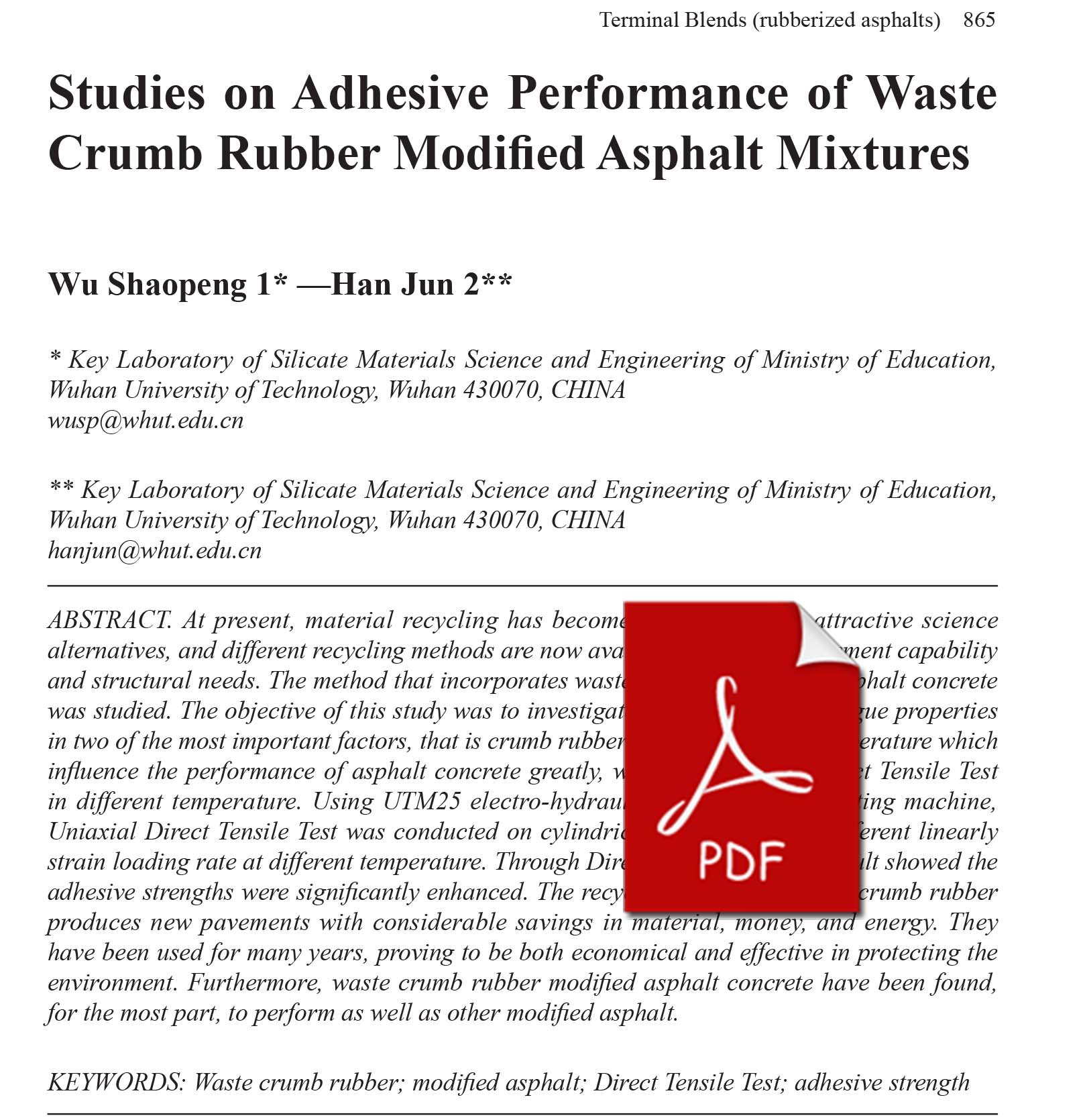 influence the performance of asphalt concrete greatly, were discussed by Direct Tensile Test in different temperature. Using UTM25 electro-hydraulic servo-universal testing machine, Uniaxial Direct Tensile Test was conducted on cylindrical specimens with different linearly strain loading rate at different temperature. Through Direct Tensile Test, the result showed the adhesive strengths were significantly enhanced. The recycling of existing waste crumb rubber produces new pavements with considerable savings in material, money, and energy. They