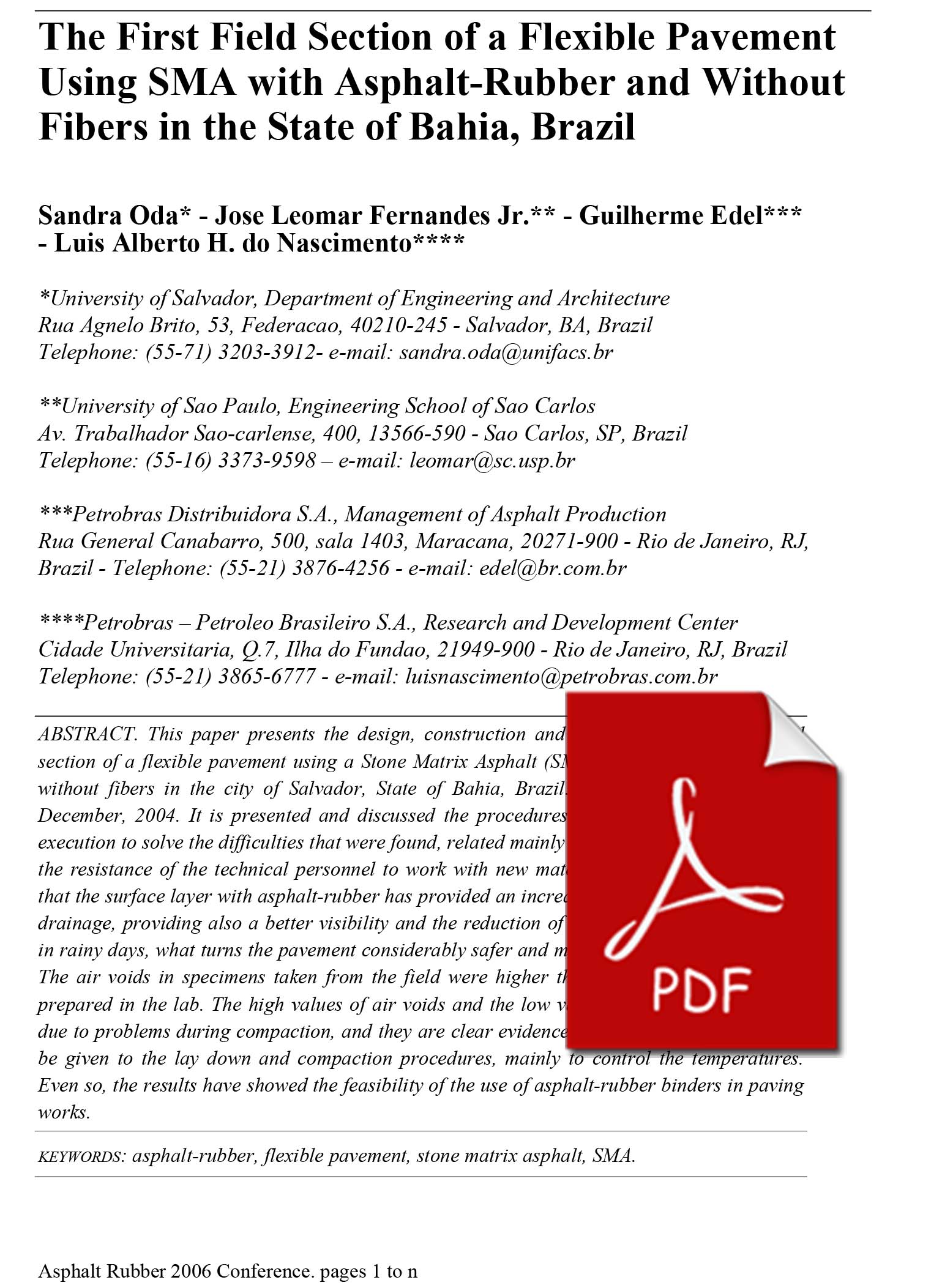 execution to solve the difficulties that were found, related mainly to the lack of experience and the resistance of the technical personnel to work with new materials. The evaluation shows that the surface layer with asphalt-rubber has provided an increase in friction and superficial drainage, providing also a better visibility and the reduction of the potential to aquaplaning in rainy days, what turns the pavement considerably safer and more comfortable to the users. The air voids in specimens taken from the field were higher than the ones in the mixtures prepared in the lab. The high values of air voids and the low values of tension strength are due to problems during compaction, and they are clear evidence that special attention has to be given to the lay down and compaction procedures, mainly to control the temperatures. Even so, the results have showed the feasibility of the use of asphalt-rubber binders in paving works.